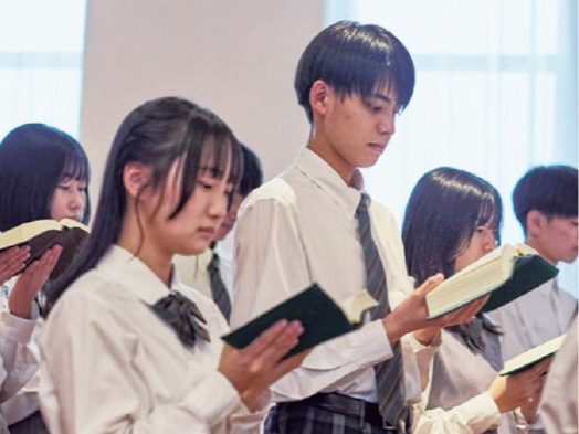 毎月チャペルに掲げる月ごとの聖句があります。現代の事象とひも付く聖書の内容についても考え、チャペルノートに感想を書きます。クラスメイトと意見を交わし合うことで、人と異なる考えを言葉にする抵抗感を和らげ、自分の考えを表現する力を養います。