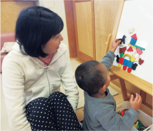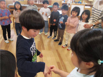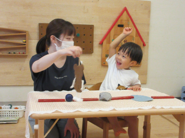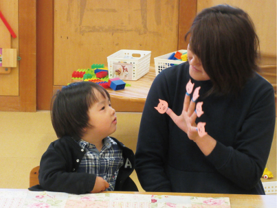 乳幼児期は、少しずつ言葉を覚えていく段階です。日々の生活や遊びの中で気持ちや欲求を言葉で表現し、周りの大人や友達と共有することで心がつながる体験を大事にしています。