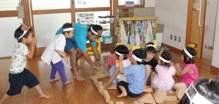 一人または数名で知っている言葉を紡いで登場人物やストーリーを考え、保育士と共に心が動く経験をするなど、子どもたちの創造性を育てます。