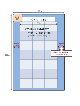 - ポスター発表では、一題当たり幅120㎝×高さ180㎝のパネルをご利用いただきます。ただし、人員スペース確保のために、両端計30cmを空けていただく事をお勧めしております。実際のポスターは90cm×180cmの大きさをご用意下さい。詳細は下図をご参照ください。