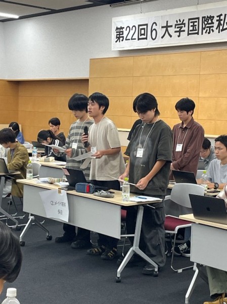 当日、討論会前には、各ゼミ学生にランダムに12のグループに分かれて着席してもらい、簡単な交流会を行いました。「国際私法で一番カッコイイ言葉は何か」といったお題で議論するうちに、「国際私法を学んでいる仲間」という親近感が生まれ、緊張感が少しずつほぐれていきました。
