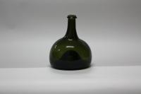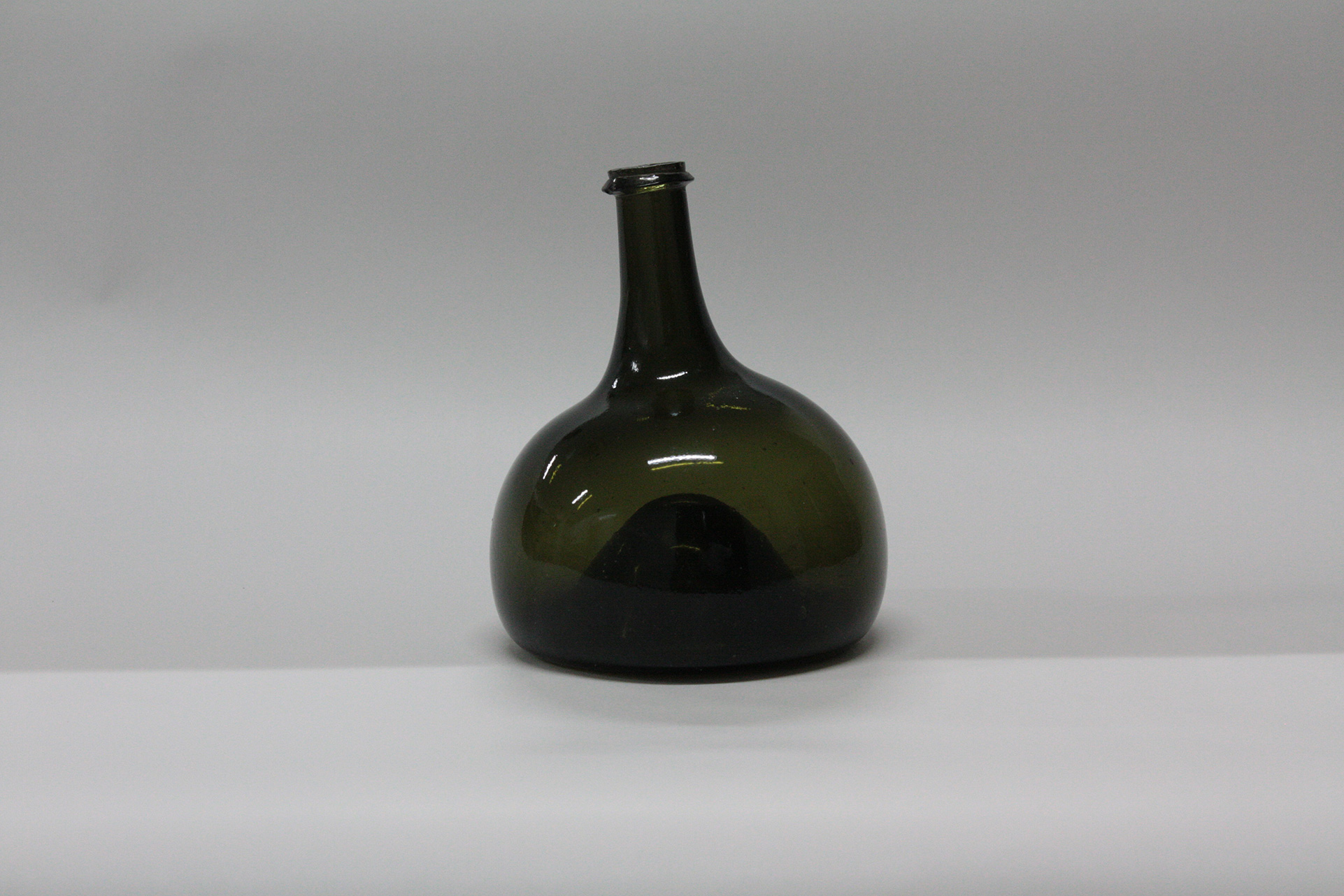 オランダで製造されたガラス製のフラスコ形ワインボトル。当館所蔵「出島蘭館図巻(N-c-018)」に同様のものが描かれており、出島のオランダ人たちも使用していたことがわかる。