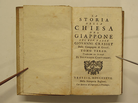 ジャン・クラッセがフランソア・ソリエー『日本教会史』をもとに、日本におけるキリスト教の布教から禁教までをまとめた教会史である。初版は1689年にパリで刊行され、イタリア語やドイツ語などにも翻訳された。本書はイタリア語版の第2版であり、N-b-126-3の欠落を補完する。
