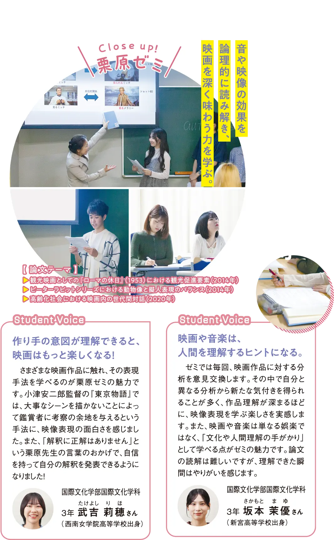 栗原ゼミでは、主に「映画」における表現方法を読み解くための方法論を学びます。具体的には、カメラの動きや速度、画面の構図、サウンド、シーンの区切り方などの表現技法に注目し、それらが物語の展開や登場人物の心情をどのように描き出しているかを分析します。また、「物語の進行=時間」の流れに沿って表現方法が変化していく過程も考察。作品の中に並走するメインテーマと複数のサブテーマを見つけ出し、作り手の意図や作品をより深く理解する力を養います。