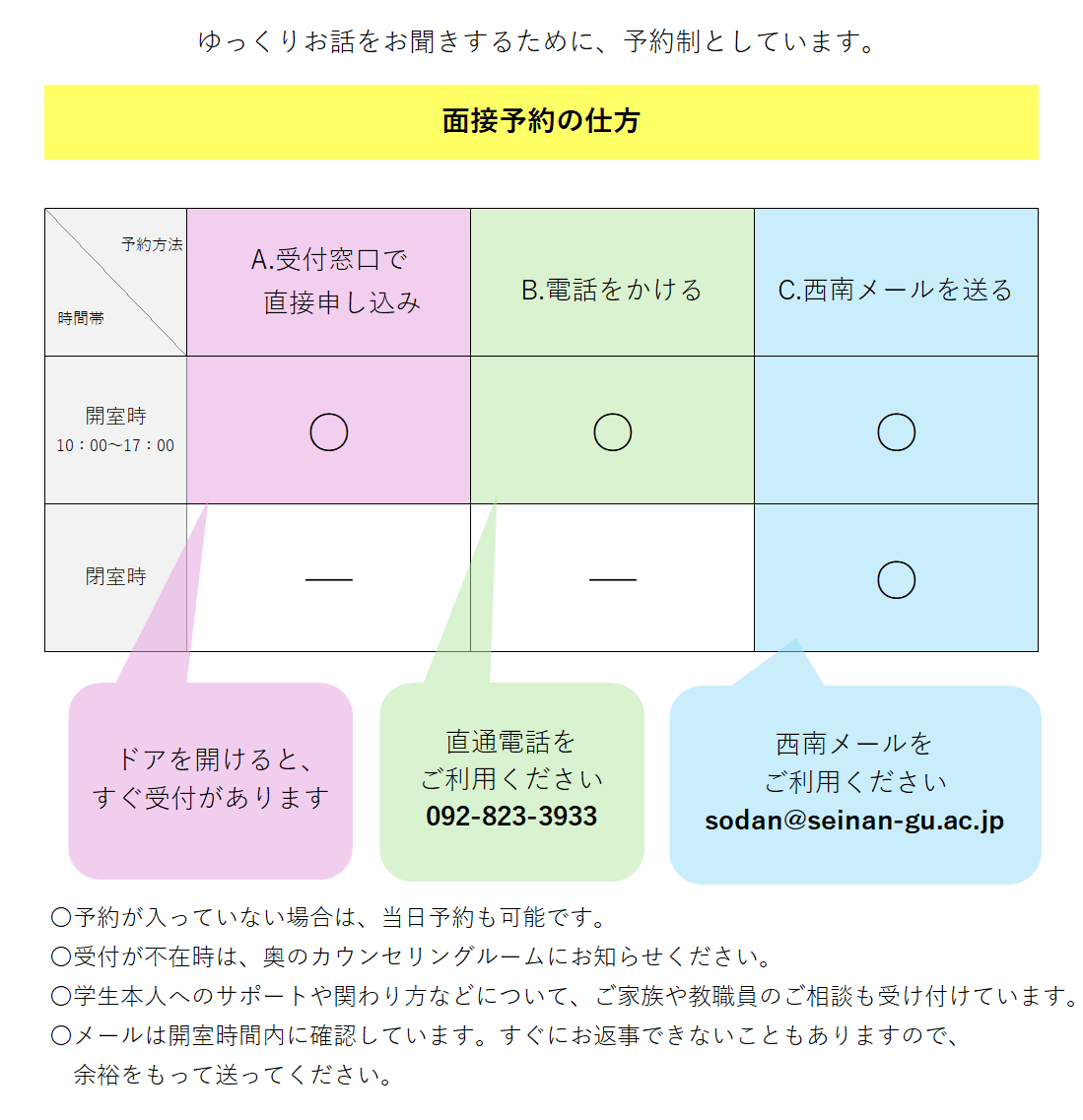 学生相談室では、西南学院個人情報保護規程に基づき相談者の個人情報を適正に取り扱いますので、安心してご相談ください。