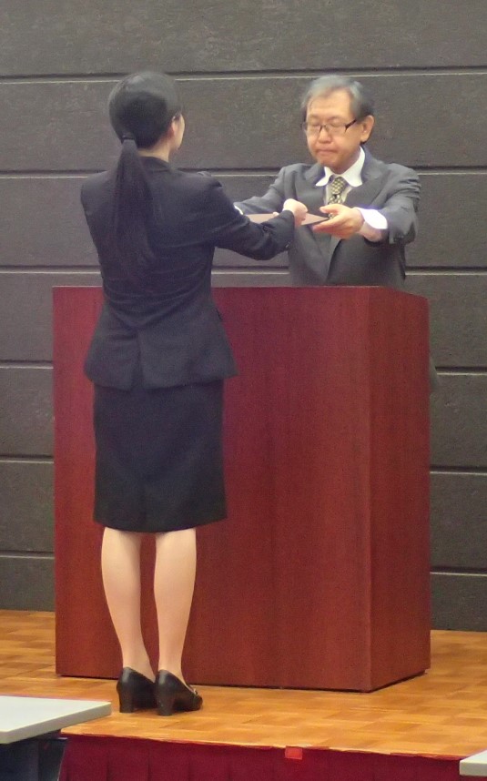 から奨学生証を受け取り、「逮捕時における被疑者の実名報道についての研究や、
