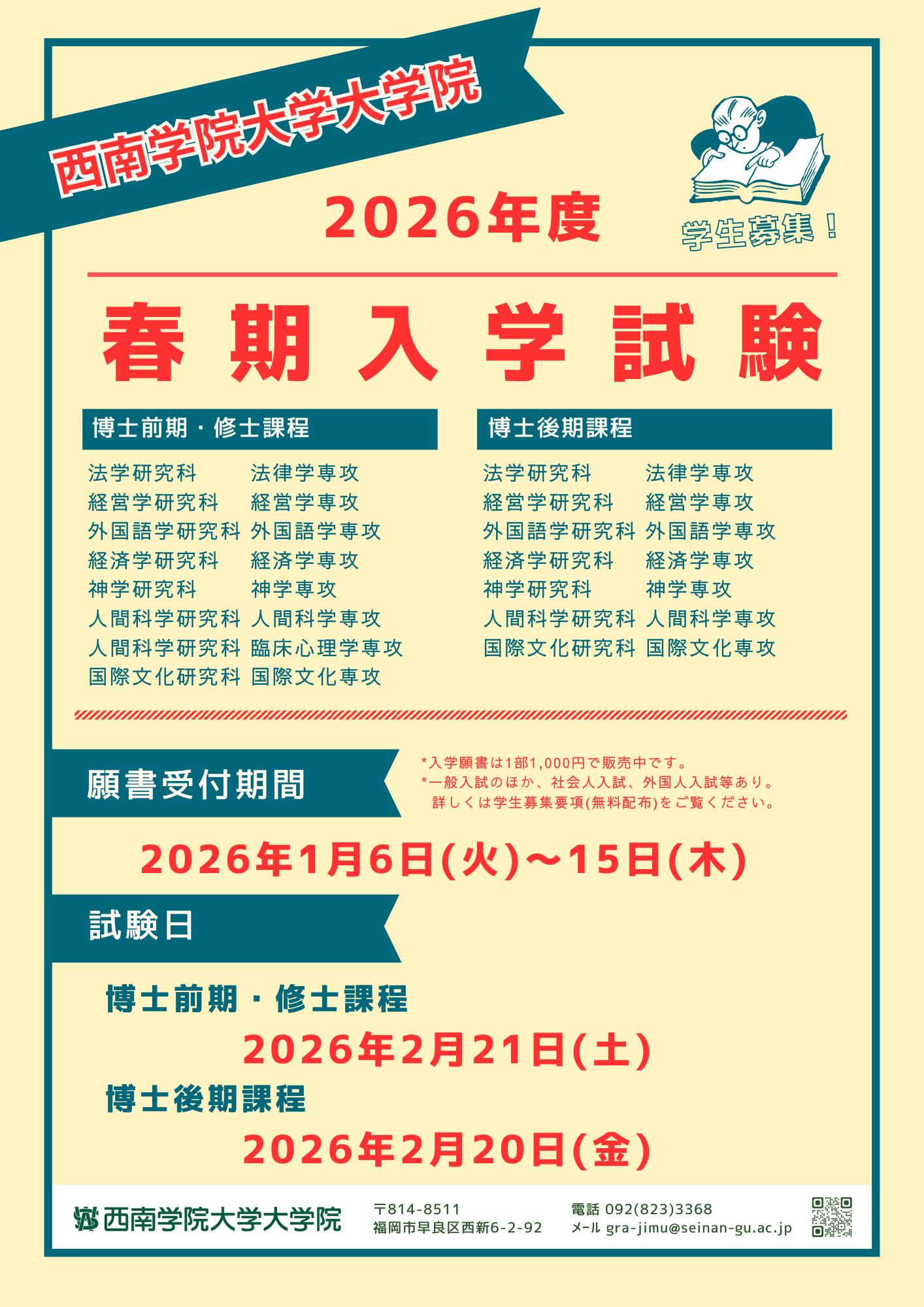 2026年度西南学院大学大学院春期入学試験を下記のとおり実施します。