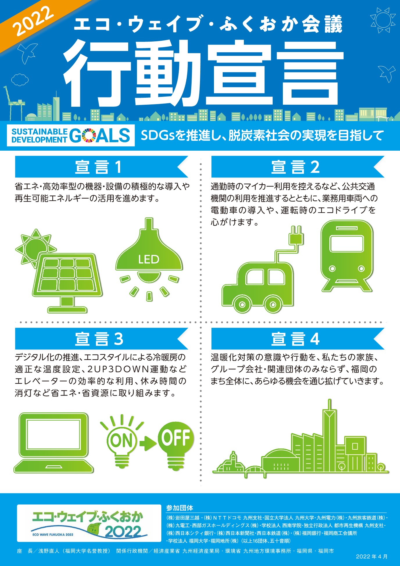 - 3 省資源、省エネルギー、グリーン購入の推進及び廃棄物の減量と適正管理に努め、環境負荷の低減に取り組む。