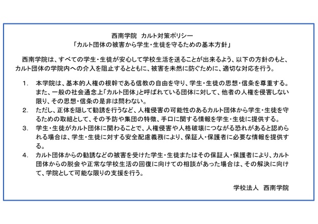 本学では、深刻化・複雑化するカルト団体の被害から学生・生徒を守るため、「西南学院 カルト対策ポリシー」を策定いたしました。