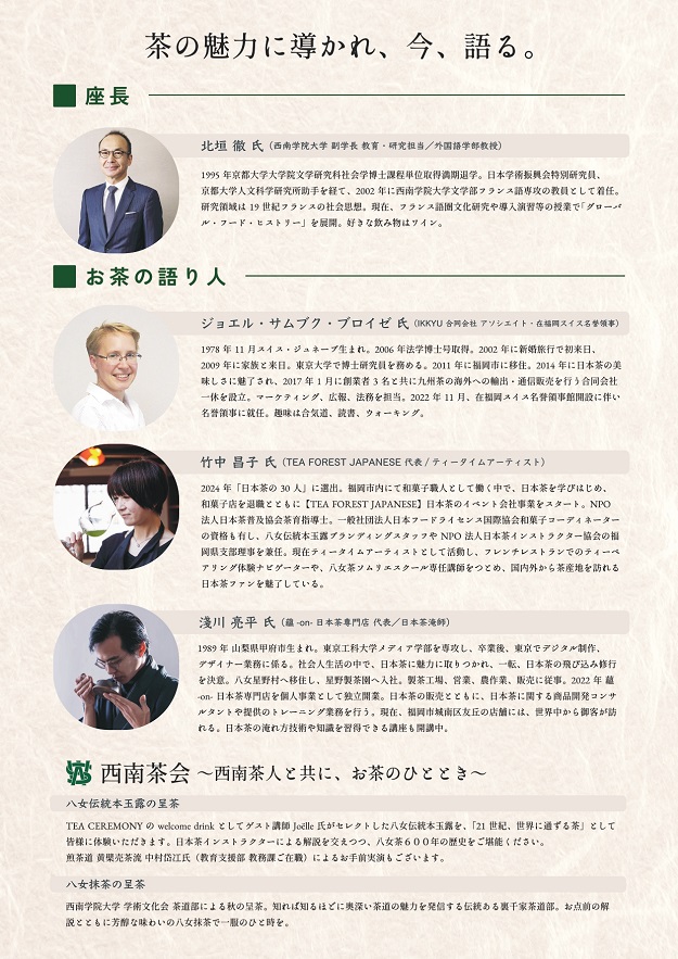 ■第二部(16:00~17:15)北垣副学長兼外国語学部教授を座長としたお茶の語り人による座談会 (一般参加可能/要事前申し込み)