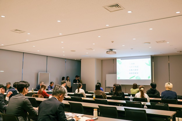 11月17日(月)、講座の最終回として「地域経済の発展と地方銀行」をテーマに、5つのグループに分かれてプレゼンテーションを行いました。発表では、地方銀行の役割を踏まえつつ、地域活性化に向けたアイデアとして、後継者不足の解消支援、第一次産業が抱える課題へのサポート、地域特産品の販路開拓、事業者同士の連携推進、伝統工芸と金融教育を掛け合わせた取り組みなど、学生ならではの具体的な提案が数多く示されました。さらに、地域通貨や独自の決済システムの導入といったデジタル技術を活用した施策も提案され、地域の発展を考えた幅広い視点がありました。学生たちは、講座で学んだ「地域の発展なくして、西日本シティ銀行の発展なし」という言葉を胸にプレゼンテーションに臨んでいました。