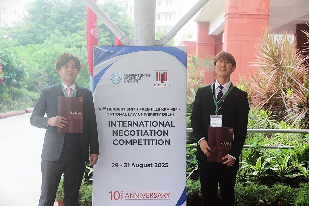 INCとは、イギリス系のハーバート・スミス・フリーヒルズ・クラマー国際法律事務所とインドのデリー国立法科大学が共同開催のもと、国際ビジネスの架空のケースをもとに、世界の法学部生・大学院生が英語で交渉技術を競い合う大会です。参加資格は毎年、招待された世界有数の約30の大学に認められるところ、本学は2019年の第6回大会から招待を受けています。今年も招待状が届き、今村さんと上野さんが出場しました。