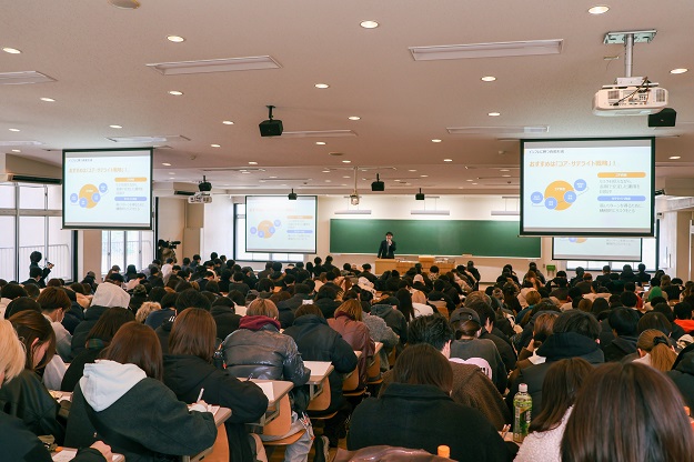 1月8日(木)、4号館203教室にて、西日本シティ銀行の協力のもと「学生のうちから身に付けたい 金融リテラシー&資産形成講座」と題した特別講座を実施しました。本講座は、世界を取り巻く経済環境や資産形成の重要性、銀行業務のデジタル化など、金融リテラシーの習得を目的としたもので、「証券論(担当:高山浩二准教授)」の授業内で実施され、約300名の学生が出席しました。
