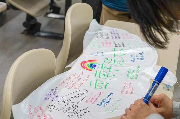 講演終了後、参加者たちは、毎年3月11日に閖上地区で行われる「追悼のつどい」において、空へ想いを届ける「ハト風船」に寄せ書きを行い、それぞれが想いを言葉に託しました。