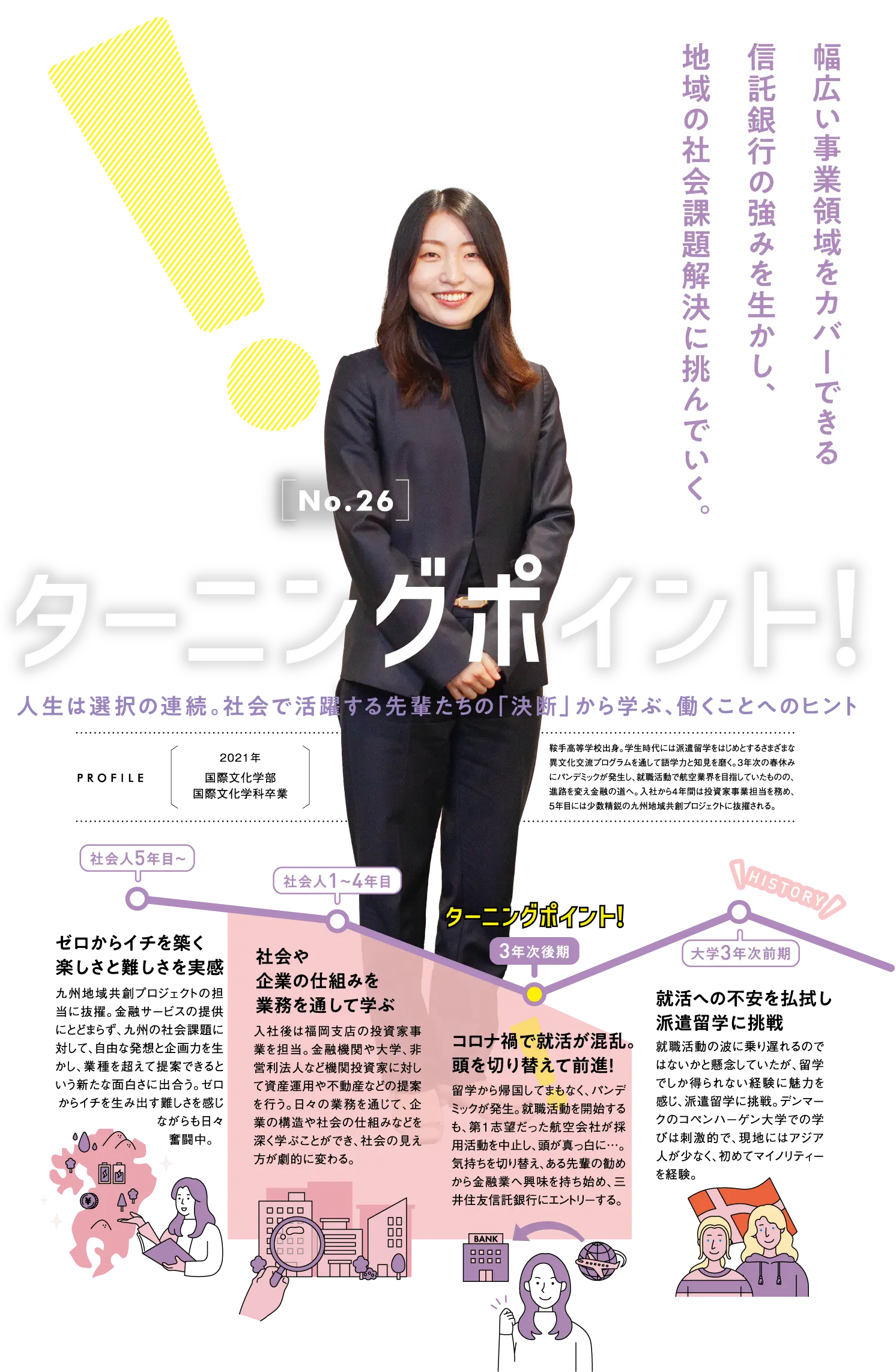 人生の好機に変えて。 - 私が金融業界に進むきっかけとなったのは、2020年に世界を襲ったパンデミックです。ちょうどデンマークへの派遣留学から帰国して、就職活動の準備に取り掛かっていた時期でした。当時の第1志望は航空業界。人の移動が制限されたことで航空業界は大打撃を受け、その年の採用活動が中止に。私は必然的に方向転換を余儀なくされました。そこで、学生時代にお世話になっていた先輩に相談。金融業界を勧めてもらい、自分なりに業界研究を行った結果、金融業界は社会貢献度が高く、自分の市場価値を高められる業界だと実感しました。数ある企業の中でも、ビジョンに深く共感したのが、その先輩が勤めていた三井住友信託銀行。幅広いソリューションを通じて社会課題の解決を目指す姿勢に心を打たれ、入社を決めました。