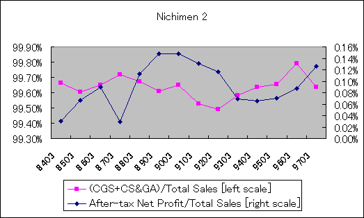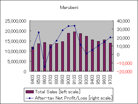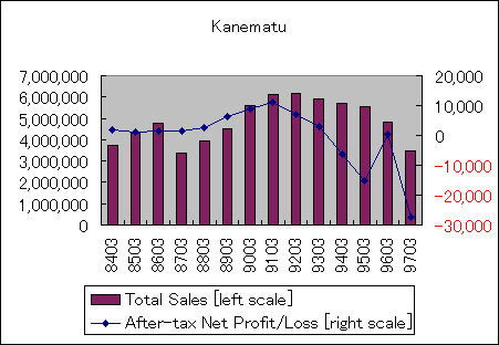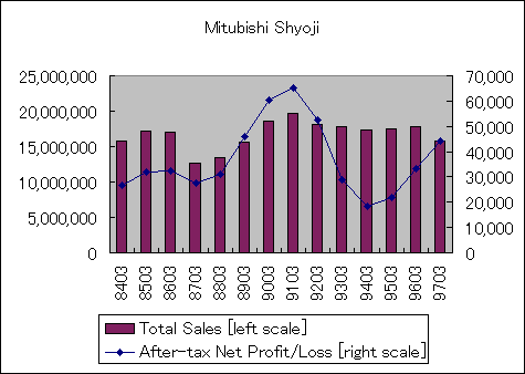 | Firms | Fiscal Year/Month | Total Sales [left scale] | 2 | 3 | After-tax Net Profit/Loss [right scale] | 5 | 6 | 7 | 8 | 9 | (CGS+CS&GA)/Total Sales [left scale] | After-tax Net Profit/Total Sales [right scale] |